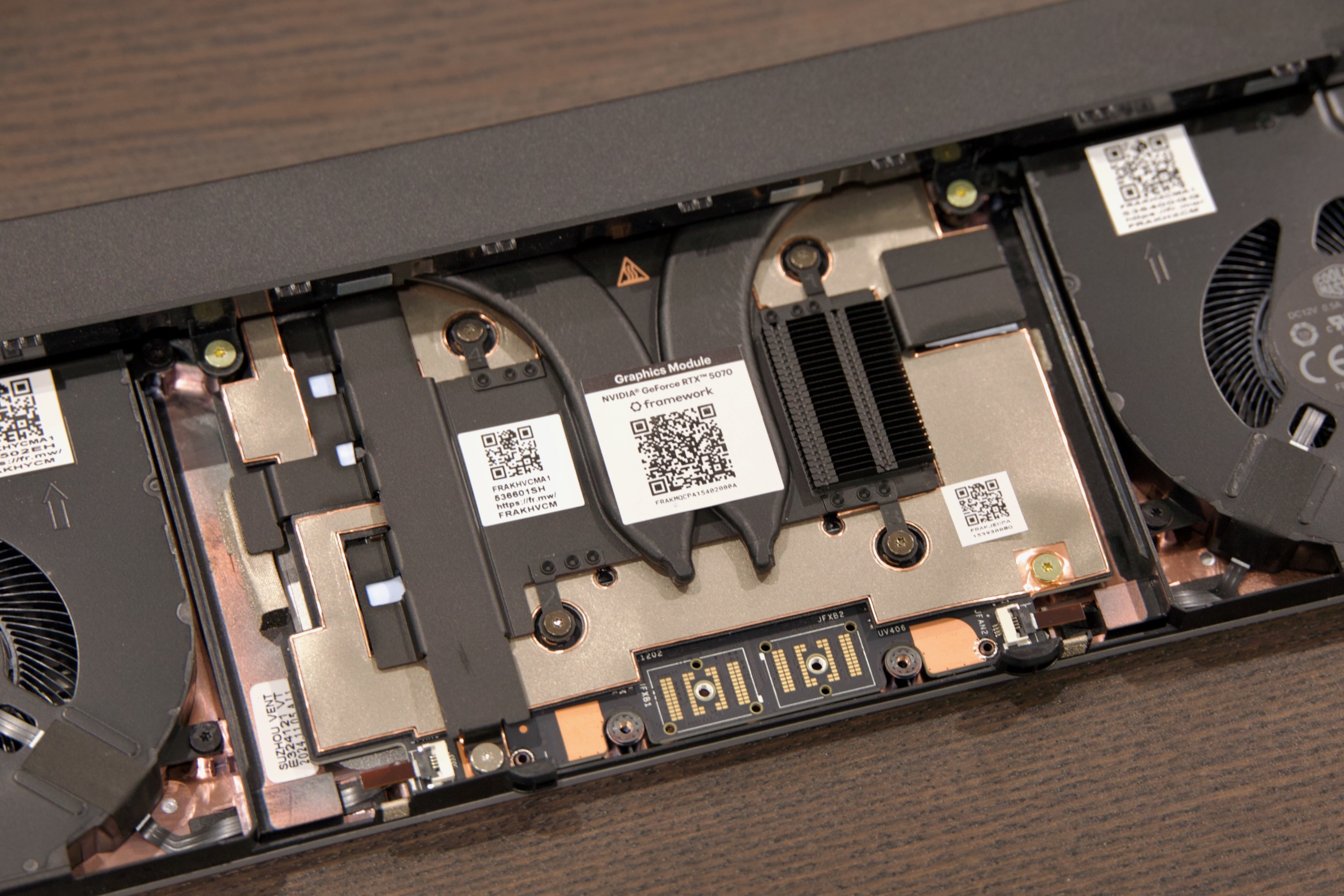 An upgraded motherboard and a brand new graphics module type the guts of this yr's Laptop computer 16 improve. The motherboard steps up from AMD Ryzen 7040-series processors to AMD Ryzen AI 7 350 and Ryzen AI 9 HX 370 chips. These are the identical processors Framework put into the Laptop computer 13 earlier this yr, although they ought to have the ability to run a bit quicker within the Laptop computer 16 attributable to its bigger heatsink and dual-fan cooling system.